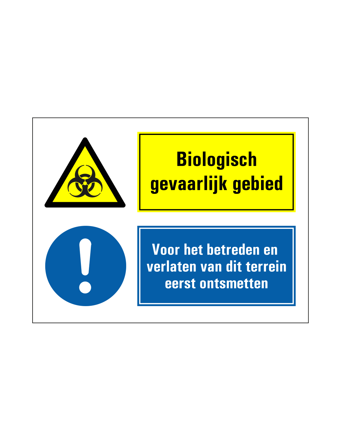 De Biologisch risicogebied, eerst ontsmetten voor betreden of verlaten sticker kun je gebruiken om aan te geven dat hier sprake is van biologisch gevaar. Daarnaast geeft de sticker aan dat je hier eerst moet ontsmetten voor je het terrein gaat betreden of verlaten.