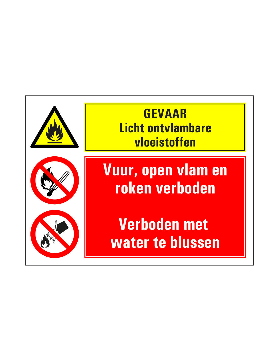 Belangrijkste kenmerken licht ontvlambare vloeistoffen, vuur open vlam roken en met water blusser verboden sticker