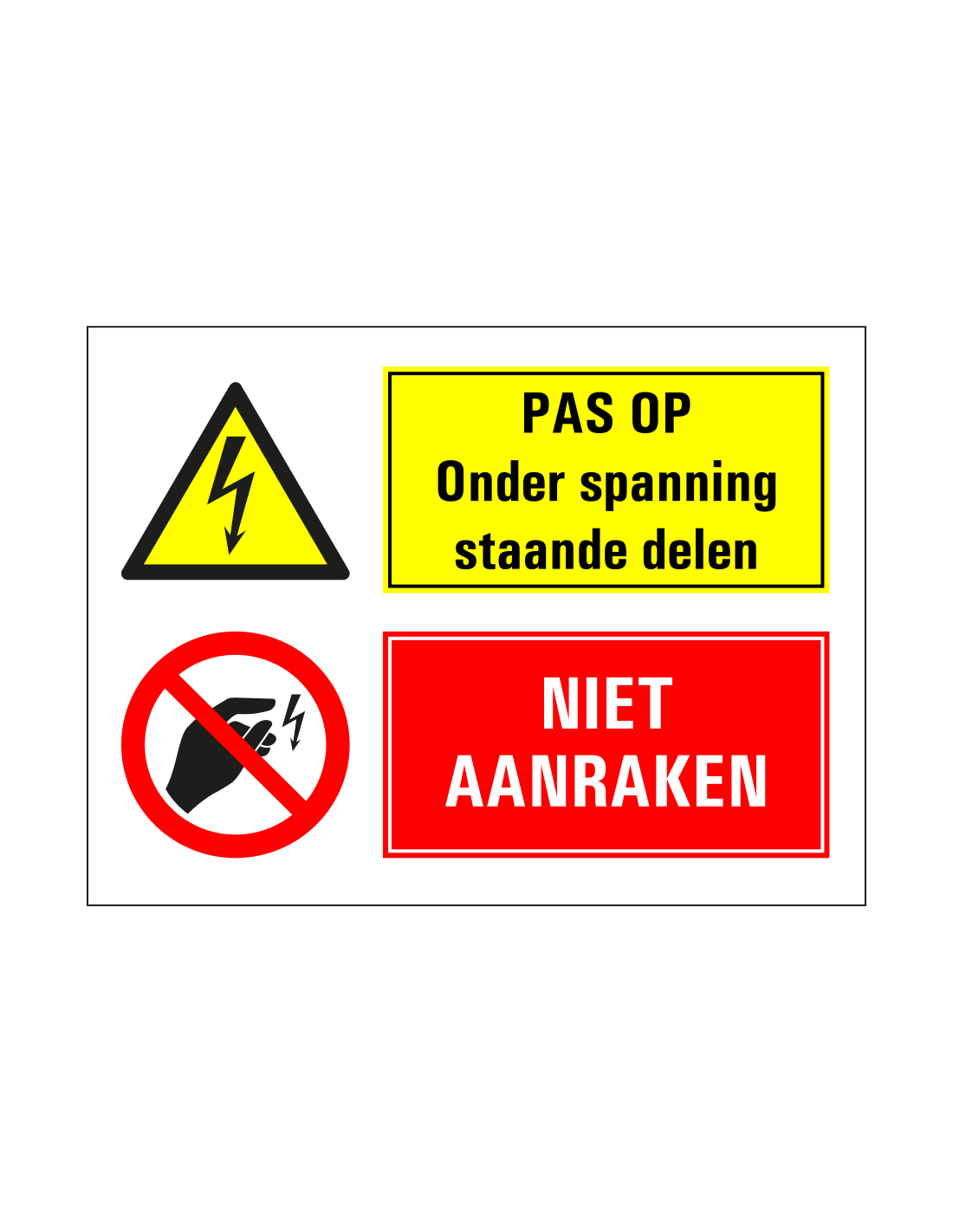 De Onder spanning staande delen, niet aanraken sticker kun je gebruiken om aan te geven dat hier sprake is van onder spanning staande delen. Ook geeft het aan dat aanraken verboden is.