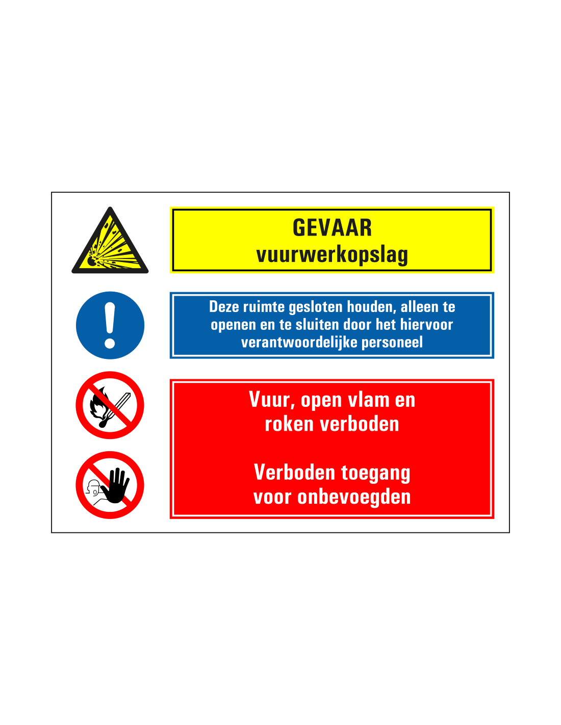 De vuurwerkopslag, houd ruimte gesloten, verboden toegang onbevoegden sticker kun je gebruiken om aan te geven dat hier sprake is van gevaar voor vuurwerkopslag. Ook geeft het aan dat vuur, open vlam en roken hier verboden is en toegang hier verboden is voor onbevoegden. Daarnaast geeft het aan dat deze ruimte gesloten moet blijven.