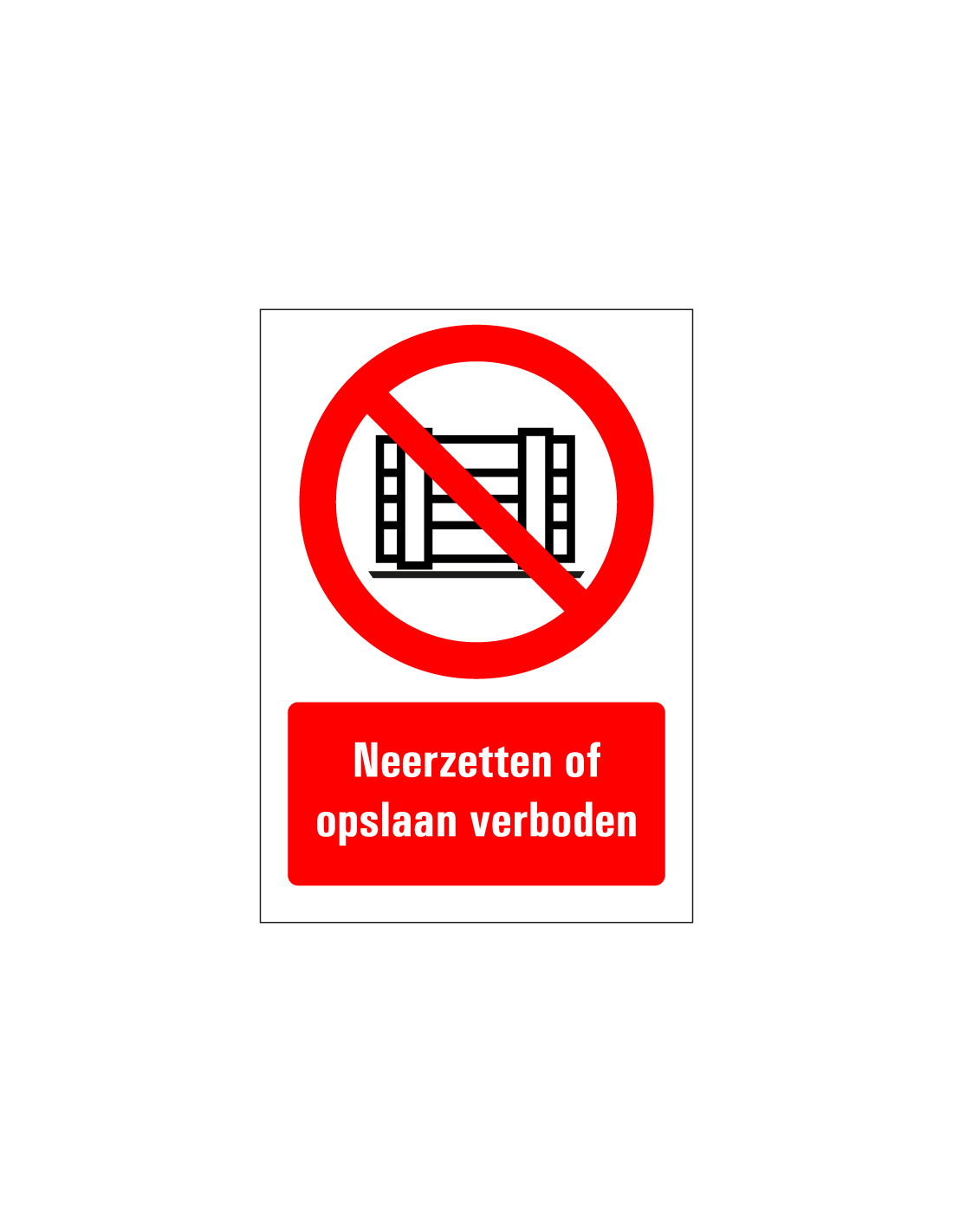 Deze sticker met afbeelding en tekst neerzetten of opslaan verboden geeft aan dat het op deze locatie verboden is om spullen neer te zetten of op te slaan.