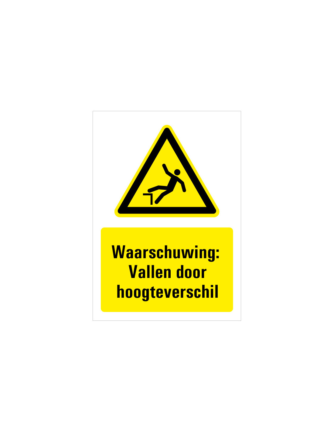 Deze staande waarschuwingssticker met tekst voor vallen door hoogteverschil wordt beschreven met een Nederlandse tekst. De sticker met tekst heeft een handige A-formaat met ISO 7010 pictogram en tekst op een witte achtergrond. De stickers van zelfklevende folie hechten het beste op een schone, droge, vetvrije en gladde ondergrond. Verder is het product geschikt om binnen en beperkt buiten te gebruiken.