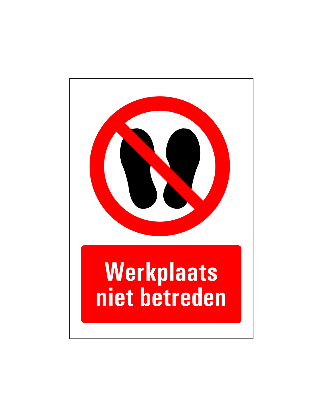 - Rechthoekige sticker met symbool voeten en rode streep en tekst werkplaats niet betreden
