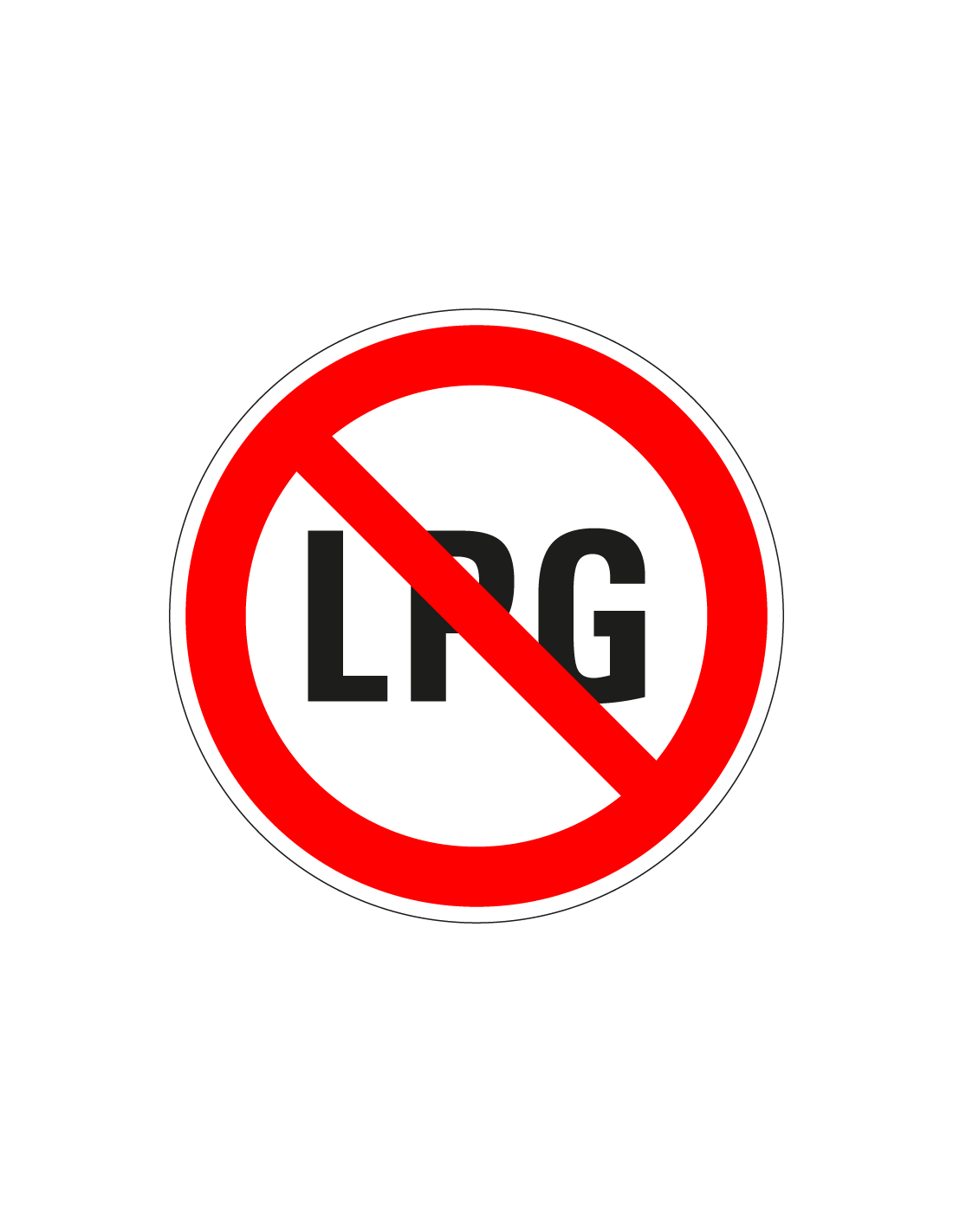 Deze sticker laat door middel van de tekst LPG zien dat het op deze plek niet is toegestaan voor auto's met een LPG-installatie. Dit pictogram kan bijvoorbeeld worden gebruikt op plekken waar een verbod geldt voor het parkeren van auto's met een LPG-installatie.