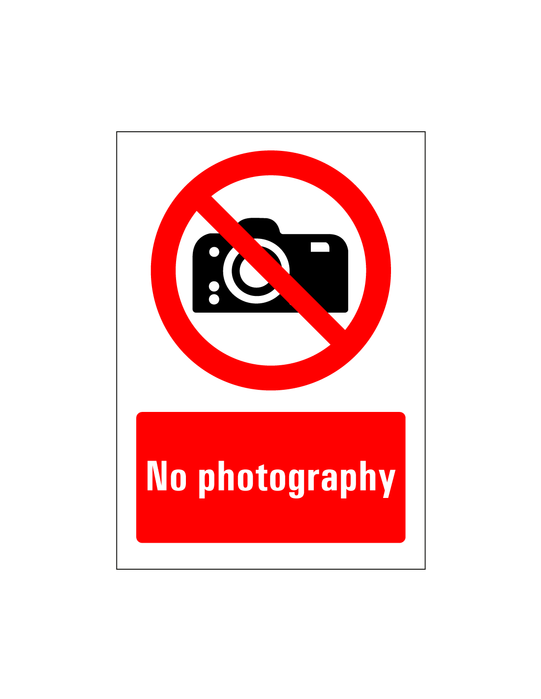 De no photography sticker is een rechthoekige sticker met het geen foto's maken symbool om aan te geven dat het verboden is om hier foto's te maken. De sticker is voorzien van de Engelse tekst "No photography" in witte letters op een rode achtergrond. De sticker is verkrijgbaar in verschillende afmetingen en is geschikt voor binnen- en beperkt buitengebruik.