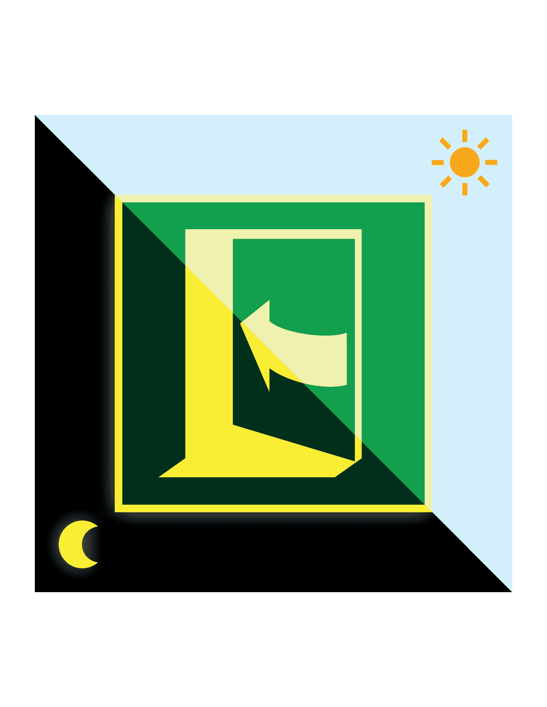 Deze lichtgevende sticker laat door middel van het symbool deur drukken links zien dat de deur aan de linkerkant geopend kan worden. Dit is bijvoorbeeld noodzakelijk in het geval dat er brand uitbreekt.