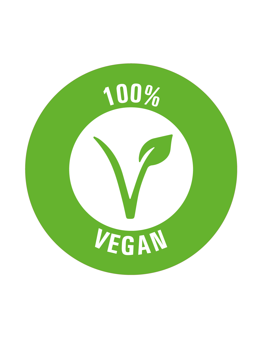 - Nederlandse tekst: 100% vegan en V-pictogram met blaadje