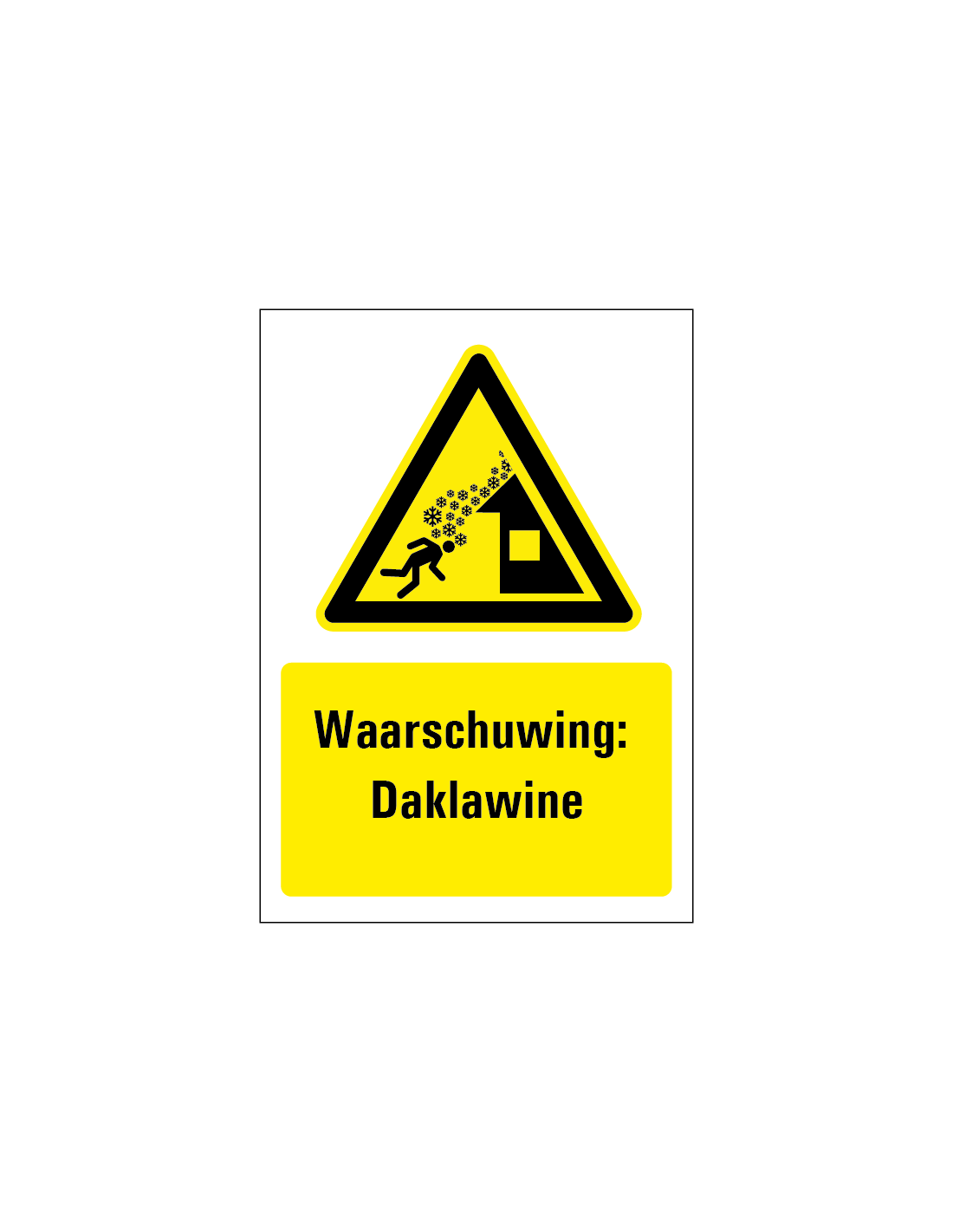 De sticker met tekst waarschuwing daklawine geeft aan dat het mogelijk kan zijn dat er voorwerpen of sneeuw van het dak af kan vallen . De Nederlandse tekst maakt nog duidelijker wat het pictogram inhoudt. Dit voorkomt tevens misverstanden. De sticker is verkrijgbaar in meerdere A-formaten en is gemaakt van polystyreen.