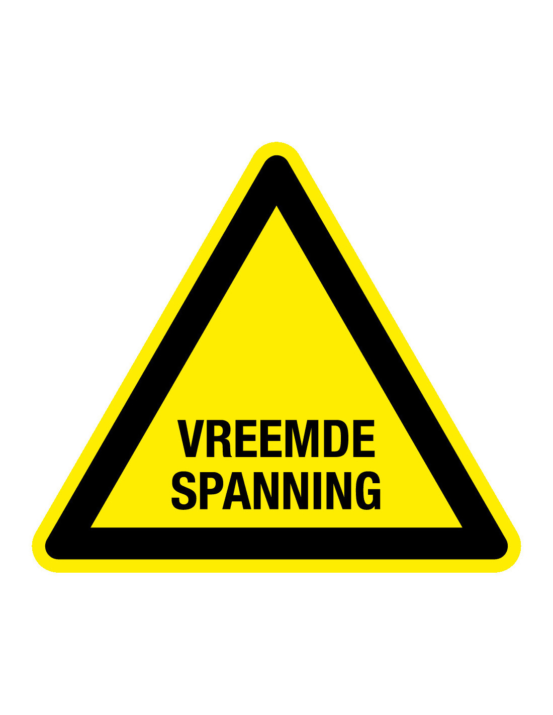 Deze sticker laat door middel van de tekst vreemde spanning zien dat er sprake is van gevaar voor elektrische spanning. Dit kan zorgen voor elektrocutie en ernstig letsel bij mensen, waardoor het belangrijk is om hiervoor te waarschuwen.